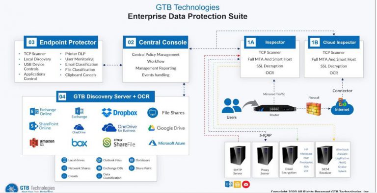 • GTB Inspector: Giám sát và phân tích lưu lượng mạng (email, web, FTP, HTTPS…), phát hiện dữ liệu nhạy cảm kể cả khi đã được mã hóa.